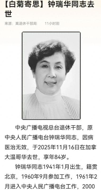 然而就在何晴去世前的一个月,还有一位著名的人去世,只不过这位去世的时候并没太多人关注到。 央视原资深播音员 这个人叫做钟瑞,原名叫做钟瑞华,从上个世纪六十年代的时候就进入了央视,担任了几十年的新闻类播音员, 并且从上世纪八十年代的时候就担任在国家各种大会上宣读非常重要文件的工作,在25年前正式退休。