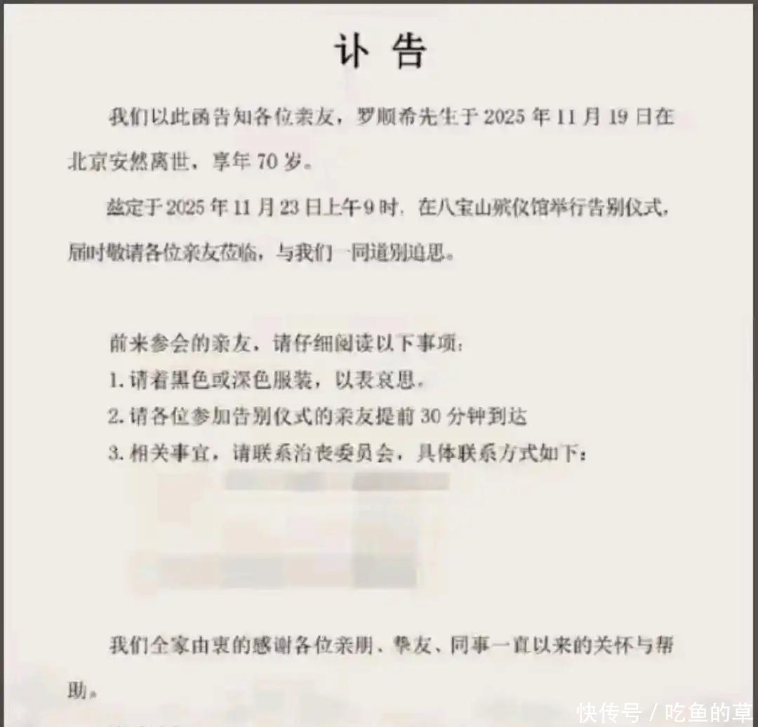 11日,一条讣告刷屏网络。罗晋经纪人代发消息:罗晋父亲罗顺希先生日在北京安然离世,享岁。消息来得突然,但细想之下,一切早有征兆。